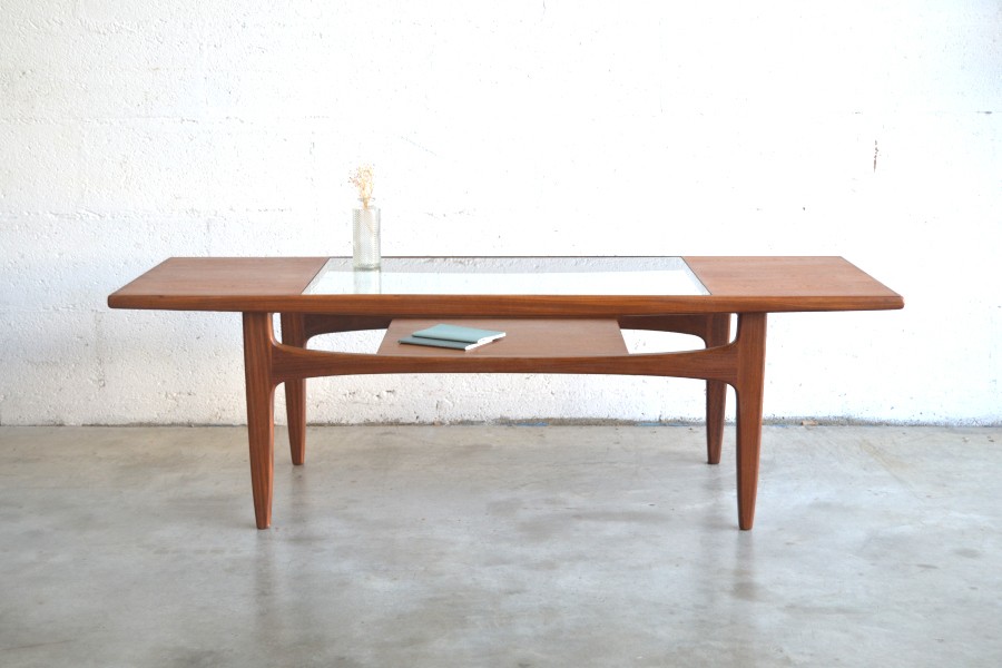 Ce grand buffet/enfilade, modèle 4060, 1966 présente un design minimaliste d’inspiration japonaise signé Ib Kofod-Larsen, fabriqué au Royaume-Uni pour l’éditeur anglais G-Plan. En teck, il présente une structure plaquée et un intérieur en teck massif. Ses larges poignées rondes sont en palissandre.