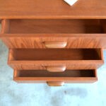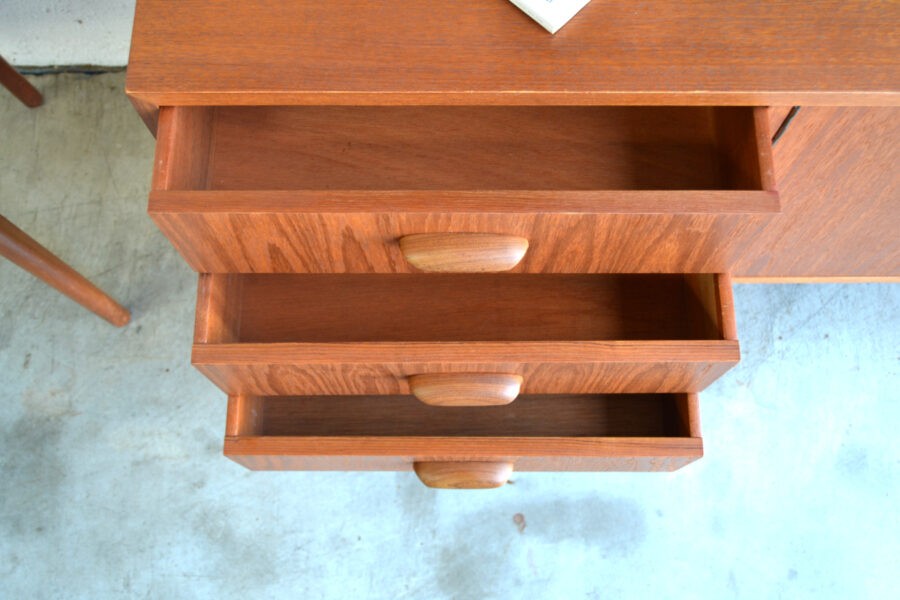 En teck et cuivre, composé de trois étagères aériennes, de trois tiroirs et de deux caissons.