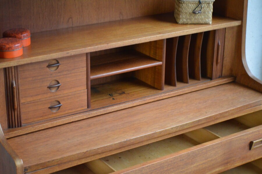 Haute bibliothèque et son secrétaire en teck combinés dans un design de Johannes Sorth pour Bornholm Møbelfabrik à Nexø, Danemark.