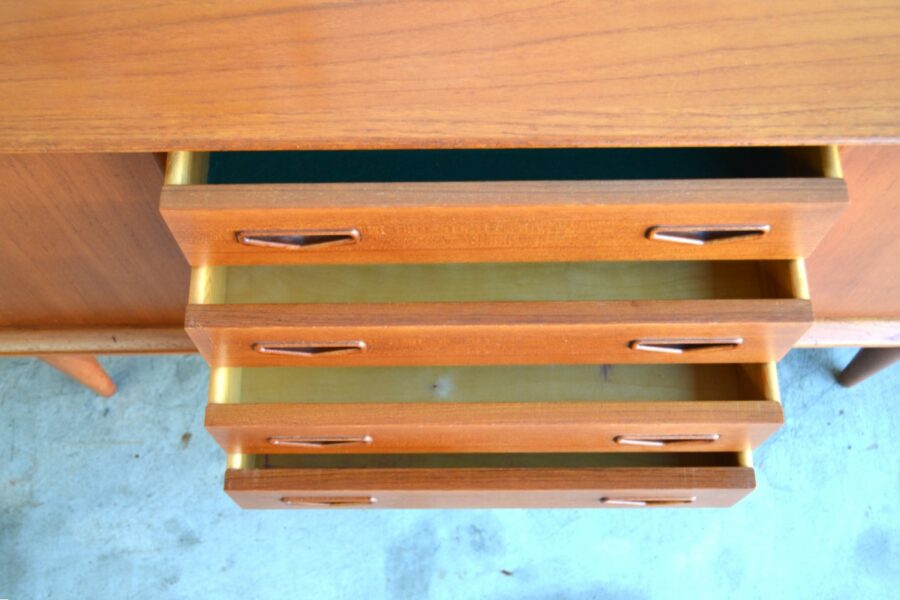 Le plateau est joliment incurvé, plus profond sur le côté gauche où il y a trois tiroirs avec des poignées sculptées en bois massif.