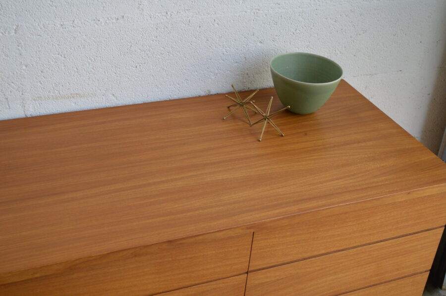 En teck, composée de trois tiroirs d’un côté, d’un espace bar au centre ainsi qu’un espace de rangement avec une grand ouverture.