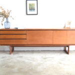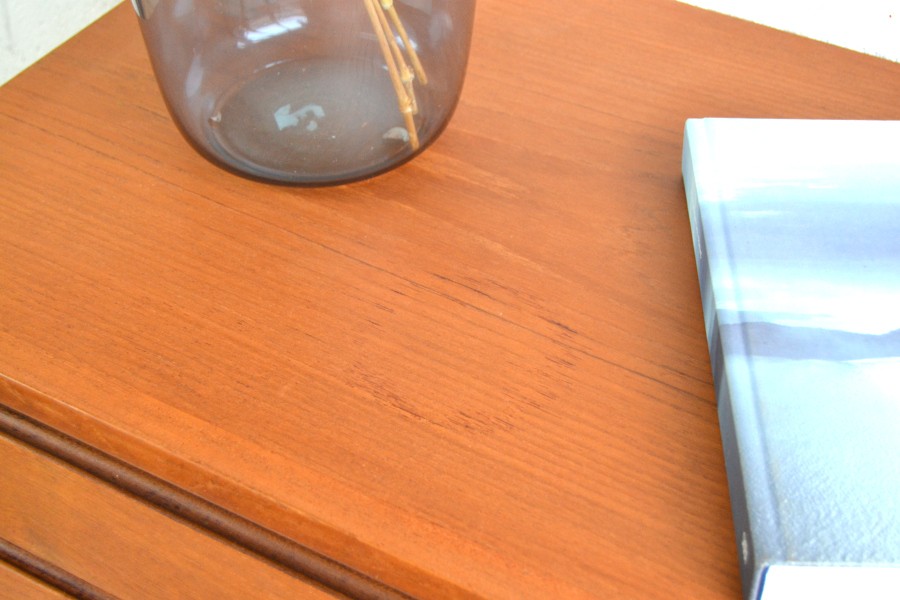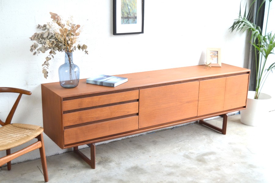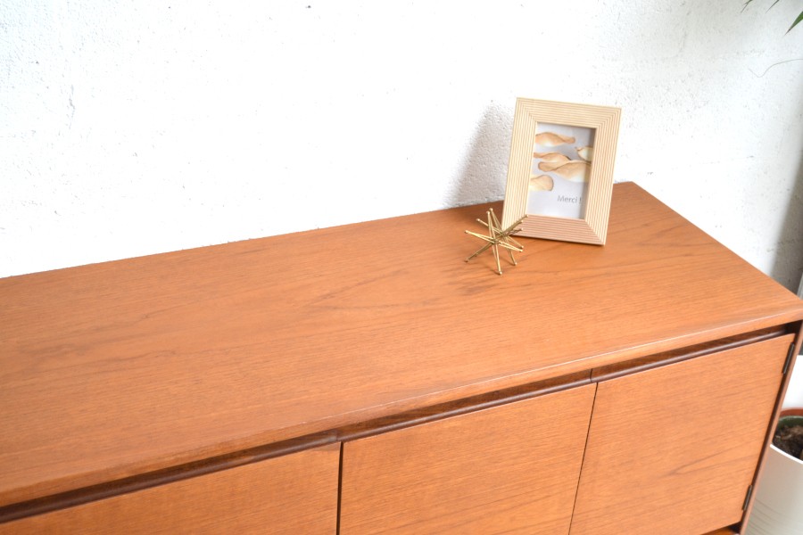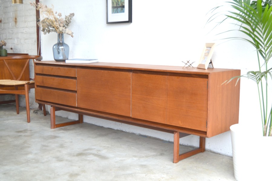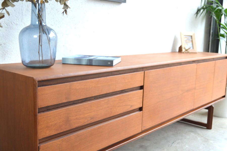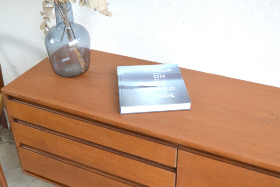 En teck, composée de trois tiroirs d’un côté, d’un espace bar au centre avec son plateau ainsi qu’un espace de rangement avec une grand ouverture.