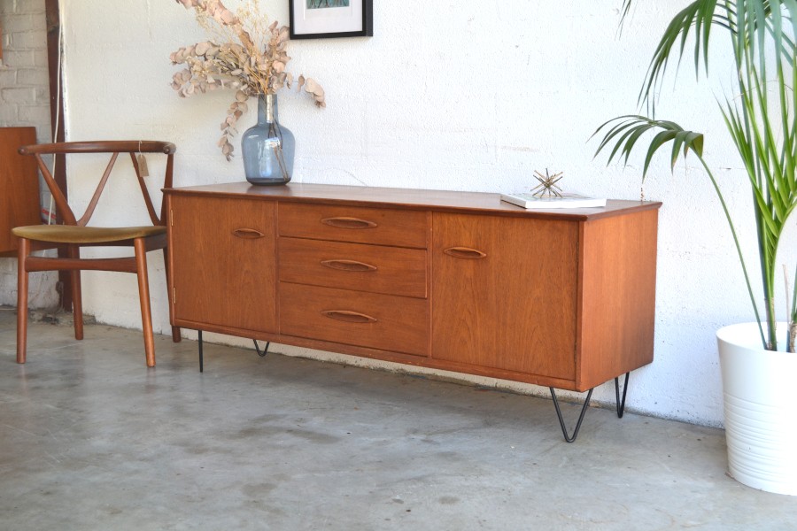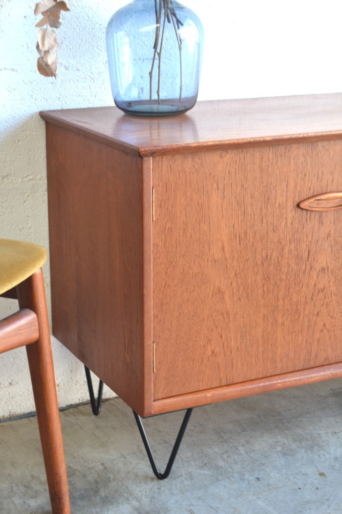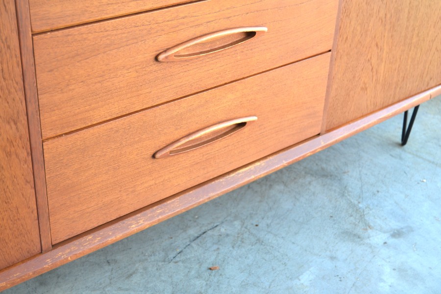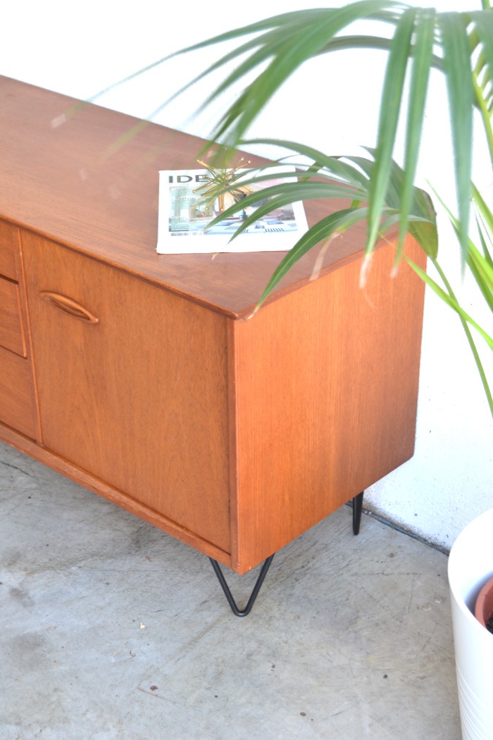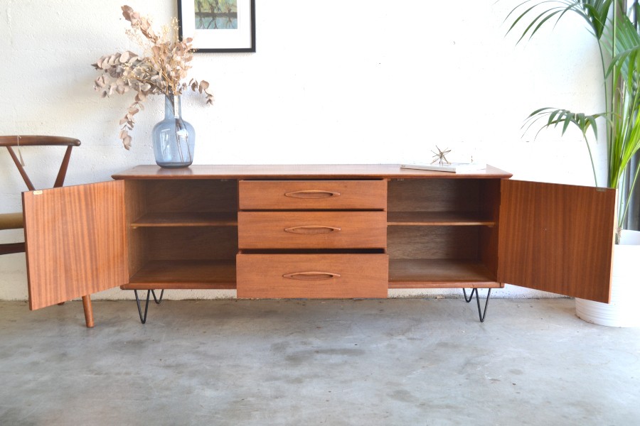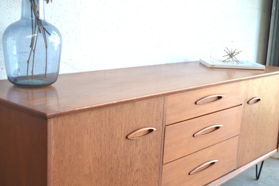 Enfilade anglaise en teck, elle ouvre par deux portes battantes et trois tiroirs en son centre.